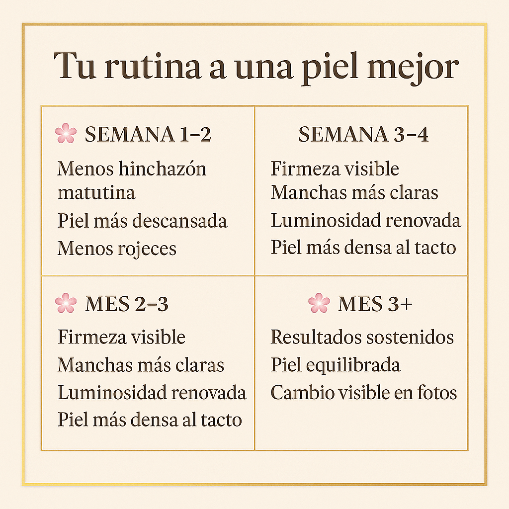 En 1-2 semanas notarás piel más calmada y descansada. Dependiendo de tu piel resultados visibles en firmeza y manchas aparecen entre 4-8 semanas con uso constante.